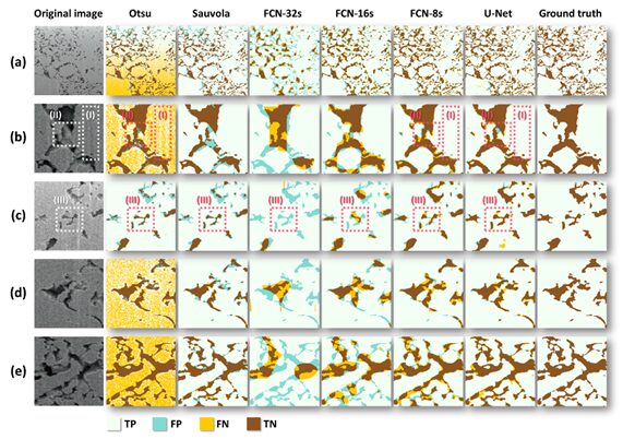 著者らは、多結晶セラミックスの3D電子顕微鏡画像に対して、U-Net2や FCN(Fully Convolutional Network)3といった深層学習モデルを用いたセマンティックセグメンテーションを行いました。 FIB-SEM で取得した3Dボリュームデータの一部を人手でアノテーションし、それを教師データとして学習させることで、超伝導相やボイドなど複数のクラスを同時に識別できるモデルを構築しています。図1では、多結晶セラミックスの FIB-SEM 画像に対し,しきい値処理、層学習モデル(FCN, U-Net など),および手動ラベリング結果を並べて比較した図であり,深層学習により相やボイドの境界が高精度かつノイズに頑健に抽出できることが分かります。最終的なモデルの精度は94.6% と報告されており、従来のしきい値処理に比べて、研磨傷やコントラストムラといったアーティファクトに対して頑健であることが示されています。学習済みモデルを用いて3Dデータ全体をセグメンテーションした結果、微細構造をボクセルレベルで3次元的に再構成し、体積分率や界面面積、連結性などの指標を定量的に評価できることが示されています。