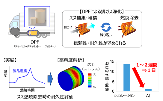 対象となっているのは、自動車の排ガス浄化に用いられるセラミック製フィルターであり、これらの製品は、走行中に排気を通過させつつ、捕集したススを再生(燃焼除去)する過程でフィルター内部の温度が急激に上昇してしまいます。このような急激な温度変化や熱衝撃が材料に大きな負荷を与えるため、内部の温度分布や熱応力の発生状態を高精度に評価する必要があります。従来はFEMどのシミュレーションが主な手段でしたが、