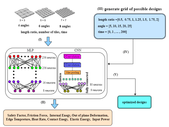 本研究では、タイル構造からなるセラミックパネルを対象に、熱衝撃を受けた際の時間依存の機械応答を評価しています。まず、FEAを用いてタイルサイズ、インターロック角度、配列パターンなどの設計パラメータを系統的に変化させ、それぞれのケースについて温度分布や応力、エネルギー吸収量などを計算しています。次に、そのシミュレーションの計算結果データを教師として、多層パーセプトロン(MLP)および畳み込みニューラルネットワーク(CNN)からなる深層学習モデルを学習させ、設計パラメータと時間を入力すると熱機械応答を高速に出力できるサロゲートモデルを構築しています。(図3)学習済みモデルを用いて設計空間を探索した結果、CNNベースの最適設計では、ベースライン構造に比べてパネル端部の温度上昇を約30%抑制できる構造が見出されたと報告されています。