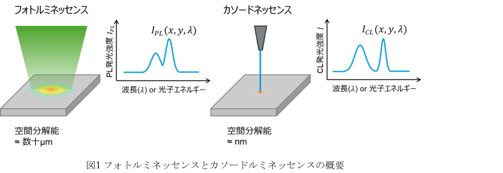 そこで、この研究では、フォトルミネッセンス(PL)スペクトルイメージング(SI)データと走査型電子顕微鏡カソードルミネッセンス(SEM-CL)のスペクトルイメージング測定を行っています。スペクトルイメージング測定により、InGaNの面内の発光の空間的な揺らぎを測定できます。PLとCLは図1に示すようにそれぞれ異なる空間分解能と励起メカニズムを持つため、面内揺らぎの多層的な可視化が可能になります。一方、スペクトルイメージング測定では、試料面内の2次元空間の中で、各位置の発光スペクトルを測定しているため、解析すべきスペクトルデータが多くなります。これを統計的に解析する必要があります。