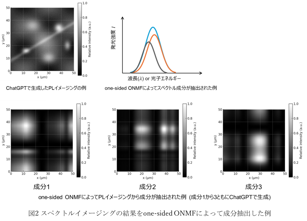 PLとCLのスペクトルイメージングデータの両方にone-sided ONMFを適用し、明確な空間分布とスペクトル成分の抽出に成功しました。スペクトルには3つの成分があることがわかりました。図2にone-sided ONMFでスペクトルイメージングの結果から成分抽出した際の例を示します(画像はChatGPTで生成したものであり、実際の実験結果ではありません、概要をわかりやすくお伝えするための図です)。